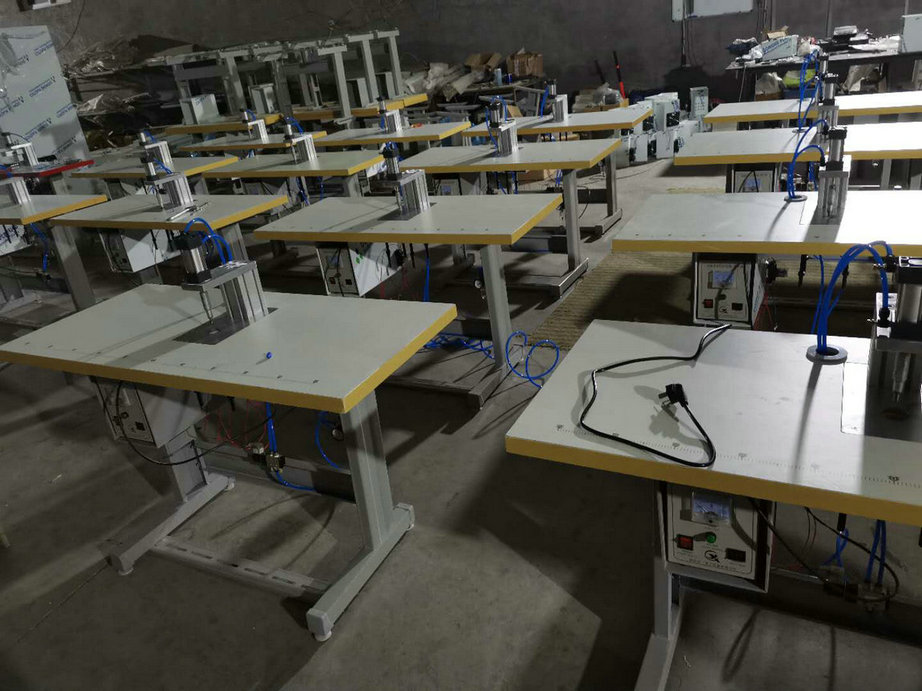 本機以超聲波將綁帶融合于口罩本體兩側,進而完成綁帶式口罩成品,只需一名操作員將口罩片置于超聲波發生器的頭上,后將綁帶放在口罩片上,腳踏踏板使氣缸向下運動,縫住綁帶和口罩片。